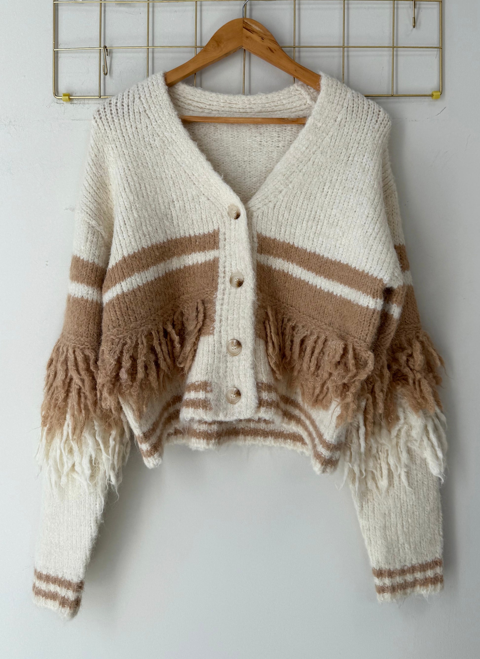 Ζακέτα πλεκτή με κρόσσια BELINA ecru/taba